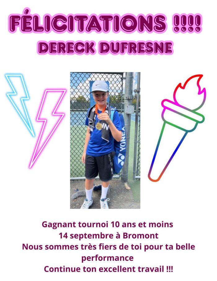 Félicitations à Dereck Dufresne qui a remporté le tournoi 10 ans et moins qui s’est tenu à Bromont le 14 septembre dernier!