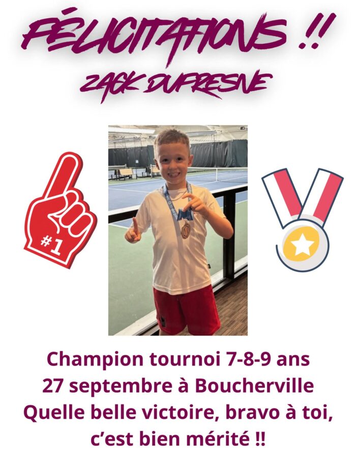Félicitations à Zack Dufresne, qui a remporté le tournoi 7-8-9 ans qui s’est tenu à Boucherville le 27 septembre dernier!