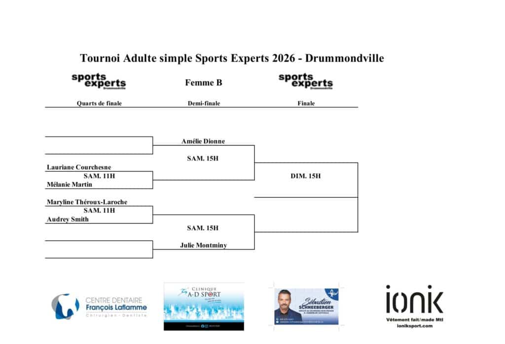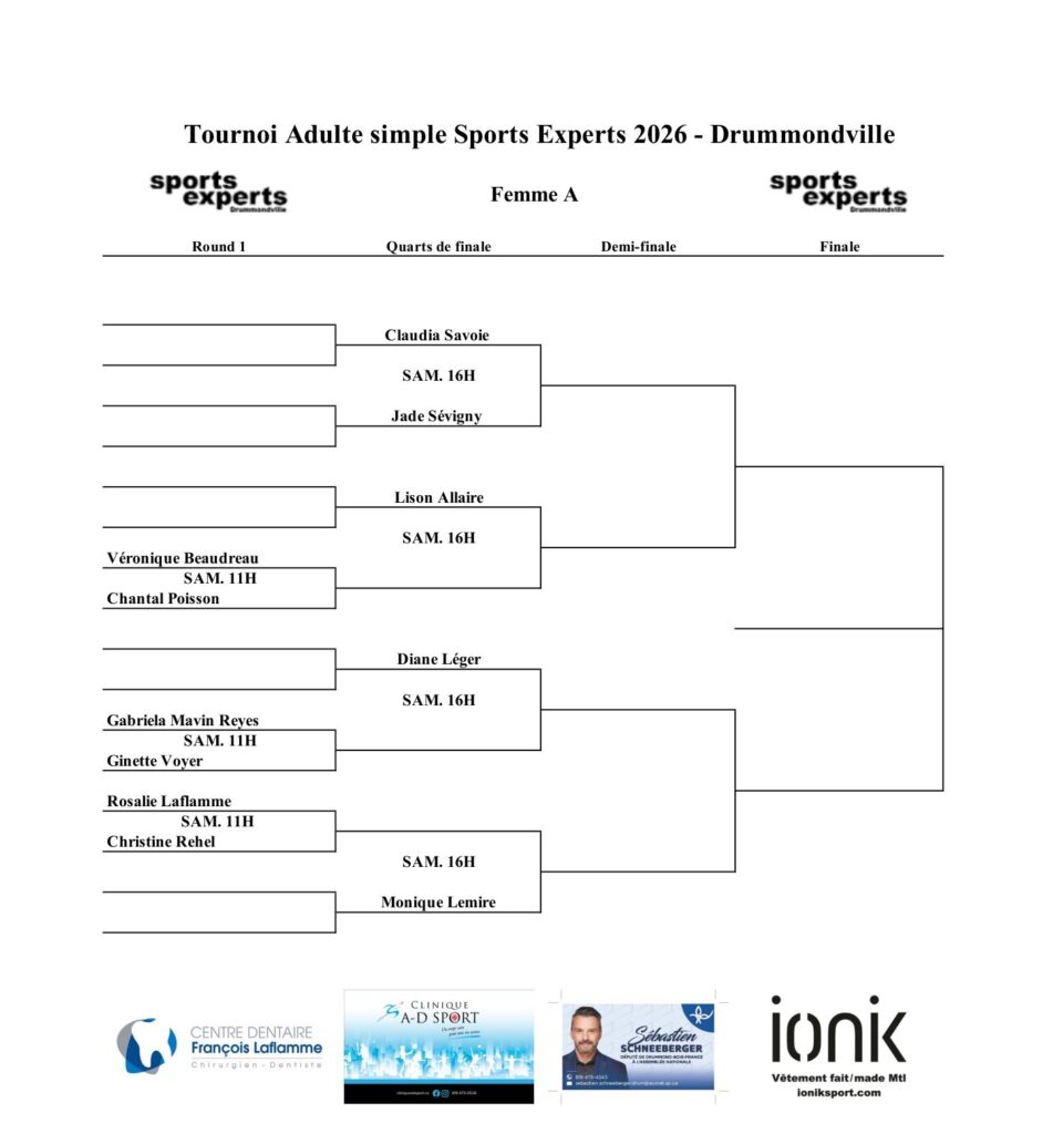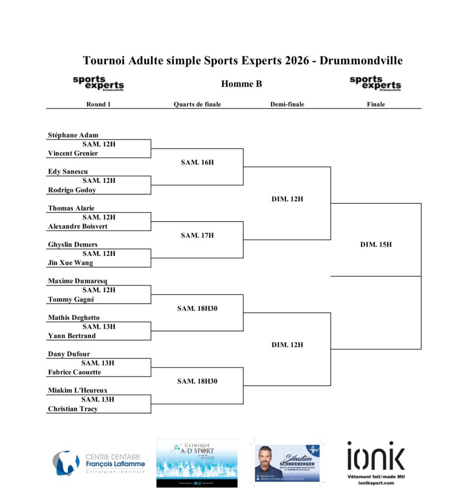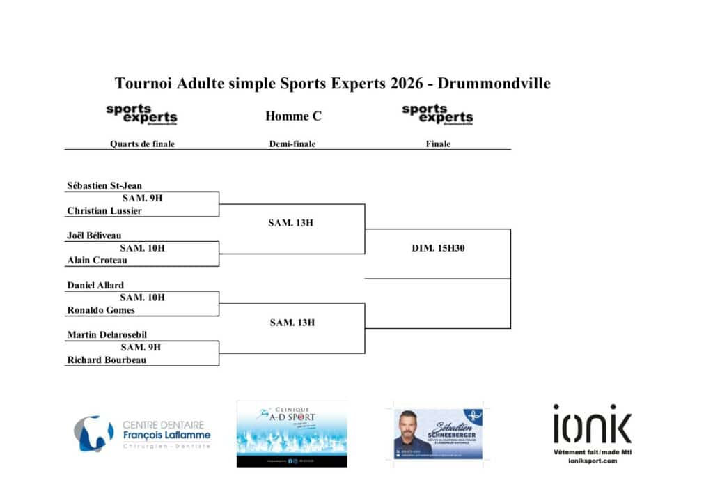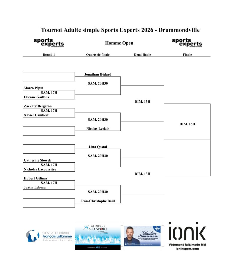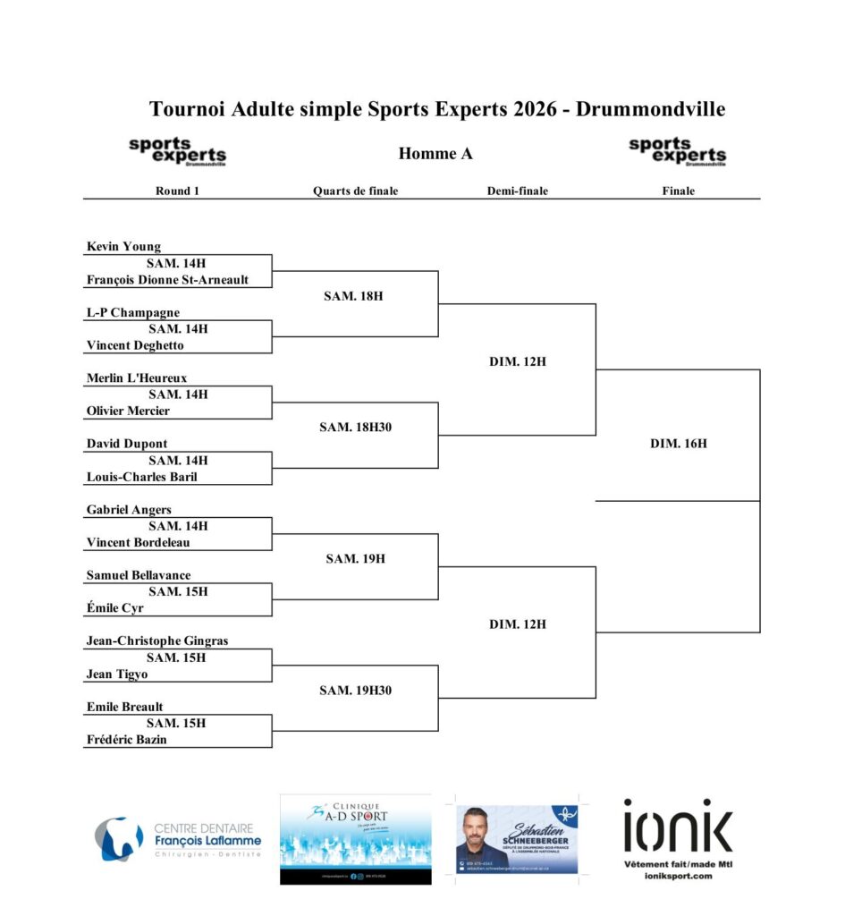 Tableaux - Tournoi Adulte Simple Sports Experts 2026 de Drummondville